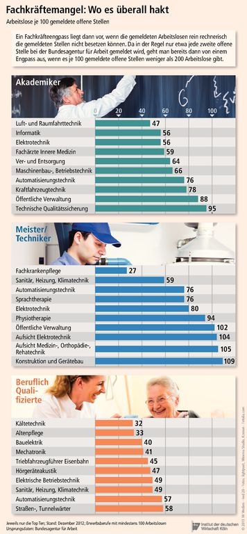 Das Institut der deutschen Wirtschaft in Köln hat sich die Fakten zum Thema Fachkräftemangel – ja oder nein – näher angeschaut. Es fehlen Altenpfleger, Mechatroniker, Hörgeräteakustiker und Elektriker. Wie groß das Problem hier ist, zeigt die Engpassanalyse des Kompetenzzentrums Fachkräftesicherung, einer Initiative des Bundeswirtschaftsministeriums.