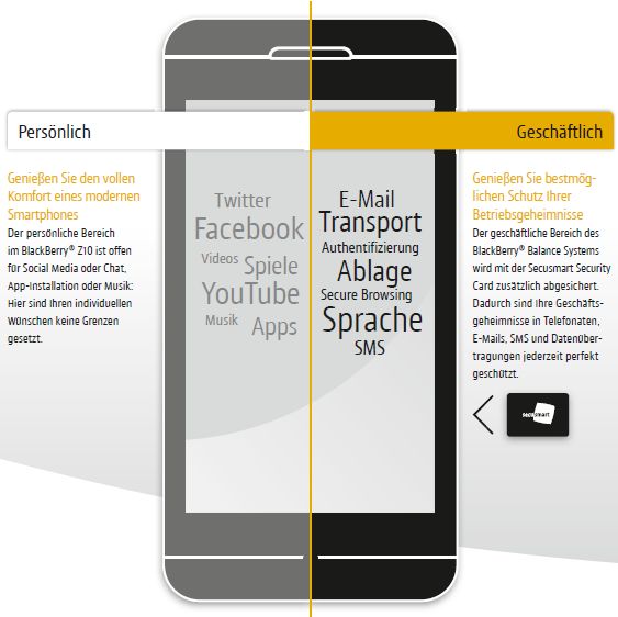 Die Lösung bietet sichere Verschlüsselung der gespeicherten Informationen, der Sprache, der Textnachrichten, des VPN und sicheres Browsen. Damit ermöglicht sie gefahrlosen Zugang zum Internet. BlackBerry Balance trennt sensible Informationen zuverlässig von persönlichen Inhalten. Kunden können einfach und sicher zwischen ihrem geschäftlichen und privaten Leben wechseln.