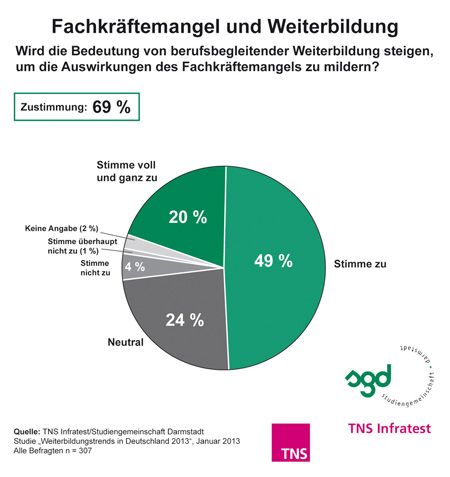 Die befragten Personalverantwortlichen sehen Weiterbildung als ein geeignetes Instrument im Kampf gegen den Fachkräftemangel an: 69 Prozent stimmten zu bzw. voll und ganz zu, dass sich die Auswirkungen des Fachkräftemangels durch berufsbegleitende Weiterbildung abmildern lassen.